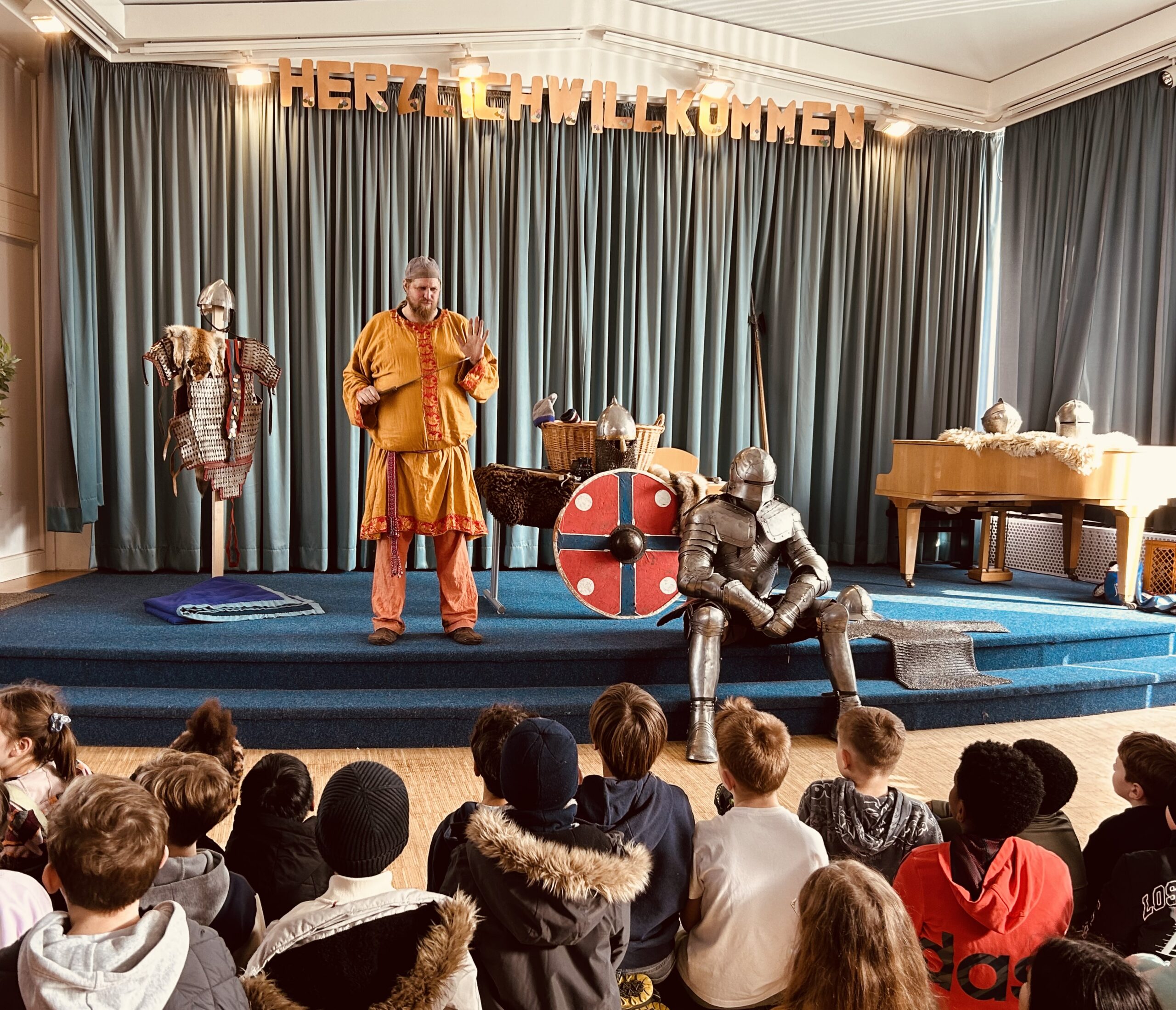 Besonders beeindruckend war die mitgebrachte Ausrüstung. Die Kinder konnten echte Nachbildungen einer Ritterrüstung bestaunen und erfuhren, wie Helm, Kettenhemd und Schild getragen wurden. Auch verschiedene Waffen aus dem Mittelalter wurden gezeigt und kindgerecht erklärt – natürlich nur zur Anschauung.