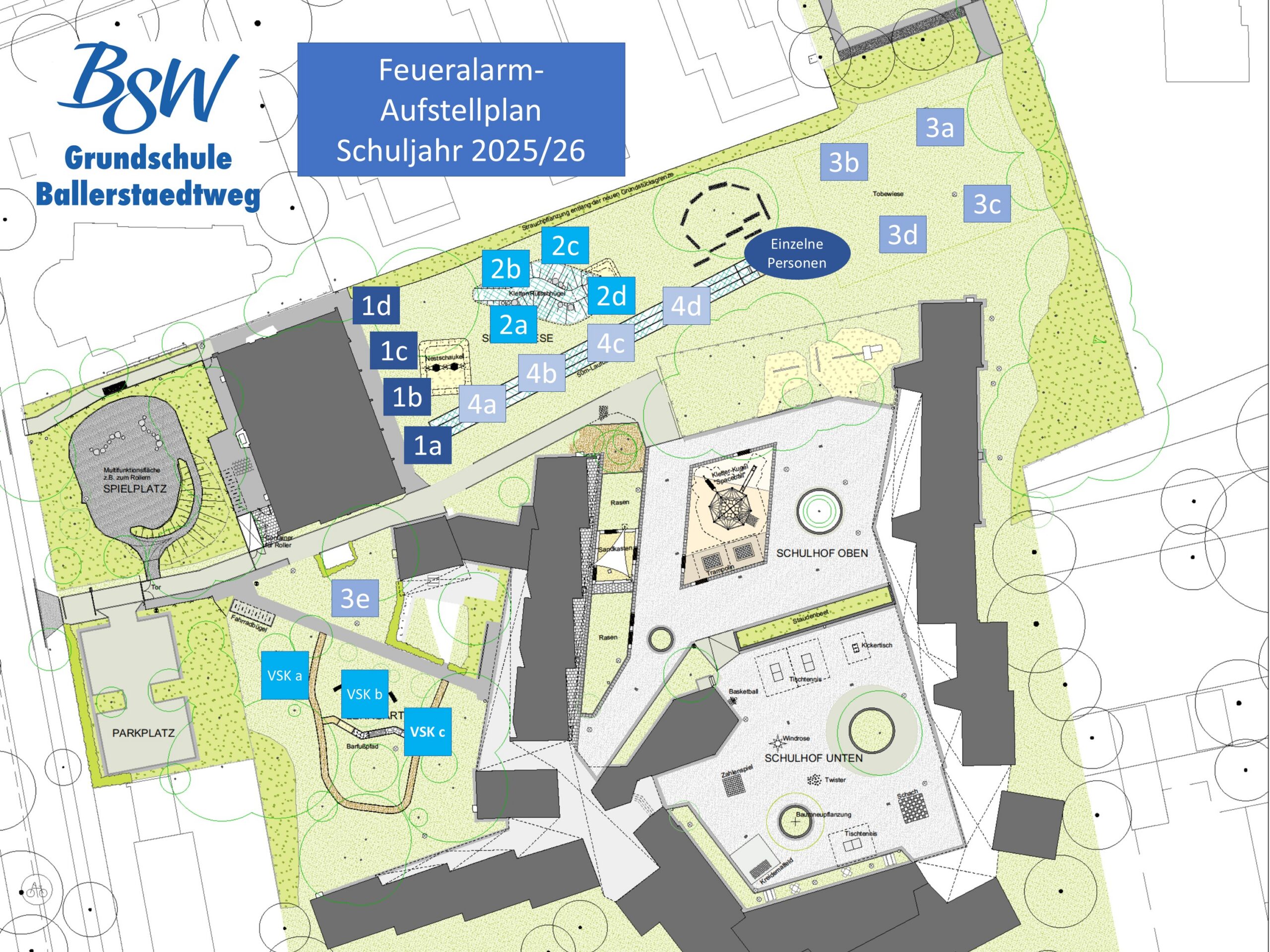 Hier sehen Sie den aktuellen Aufstellplan im Falle eines Brandes; die Schulkinder über viermal jährlich die Evakuierung (je zweimal am Vor- bzw. Nachmittag, je zweimal an- bzw. unangekündigt). Besucher:innen begeben sich bitte umgehend bei einem Feueralarm auf die Wiese zur Sprunggrube (Markierung „Einzelne Personen“).